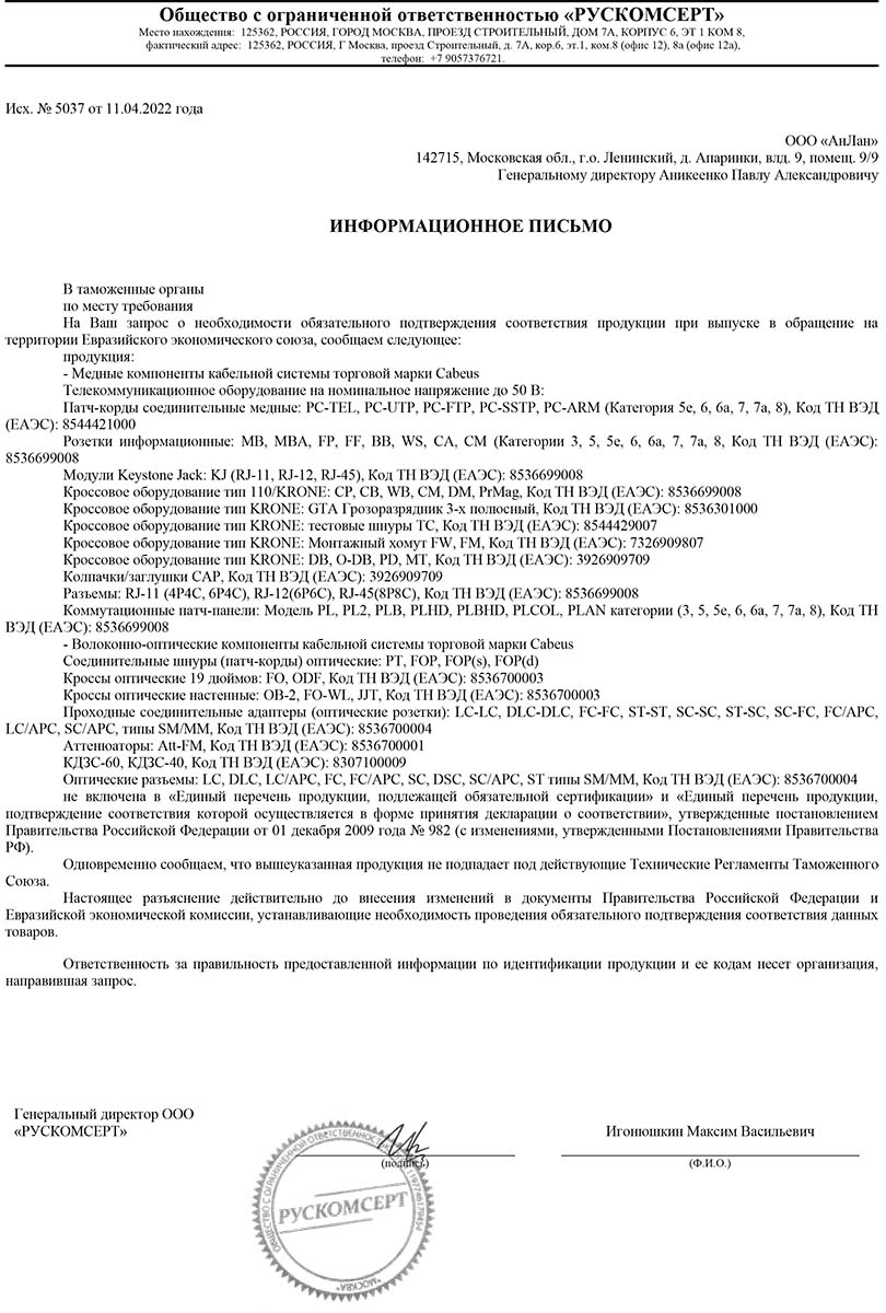 Диаметр кабеля: 5,5 мм ± 0,2 мм